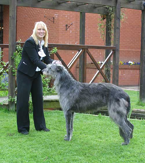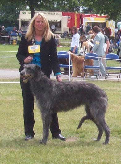 once in a lifetime dog, quiet and gentle to live with and a born show girl. She was top puppy bitch at Crufts 2000 being beaten to the top puppy slot by Ch Shielhill Bran to Kilbourne, who was interestingly sired her 1st litter in 2004 and also went on to become a champion. The judge was Denise Courtney. Skylark continued her winning ways with 12 CC'S 7 BOB'S and 6 Reserve CC's She was R B.I.S. at the Deerhound Club Show 2002 and Top Deerhound 2003. She qualified and was invited to take part in the prestigious 64 top dogs in the U.K. but it clashed with our club show 2005. Her daughter Greyflax A Kind of Magic was B.P.I.S. alongsaide her in 2005. She has produced 2 litters, we had despaired as she missed twice and wel felt she must be infertile until tests showed we had to mate her on day 5 of her season, trust Skylark to be different! From her first litter of 5, 3 are being shown successfully in the u.k. Greyflax A Kind of Magic Greyflax Myth to Kilbourne and Greyflax Mystic to Jamailson and Greyflax Fabel is in Germany with our friend Anna Schmeer. Her second litter was born in August 2005, Glenis and Mick Peach have a very promising male Greyflax The Mighty Quinn, while Monica and Steve Gibb have returned to the U.S.A. with Greyflax Miles to go where we hope they will have some fun with him. With only one bitch in this litter, Greyflax Angel, we had little choice, we have kept her and so far she is looking nice. Having been out of the ring since her win at the breed show in April 2005. We decided her 'swan song' would be in the veteran class at Crufts this year. She is carrrying a little excess weight, but was fit and well muscled . Our judge Mrs Eve Hamilton gave her the reserve CC, we were delighted, but just the joy of running in the ring with her for the last time was a wonderful and really quite emotional. She will stay at home and now hopefully not get any fatter but as an accomplished thief (and very spoilt) - don't hold us to that! May 2007 Skylark is no longer with us, she has left a legacy which we are thrilled with, her daughter Greyflax A Kind of Magic, son Ch Greyflax Myth to Kilbourne and GreyflaX The Mighty Quinn to Kilbourne, to name a few, carry the torch. She will be sadly missed, a very special hound. top brood bitch 2007 |